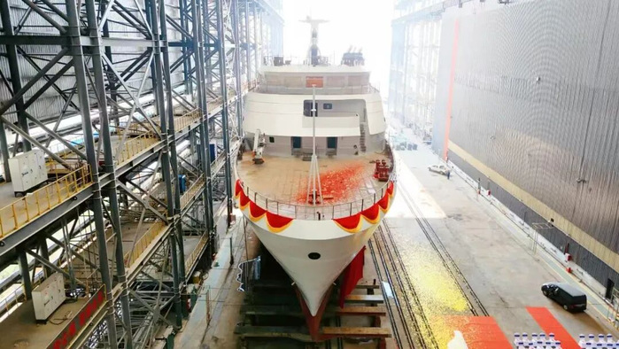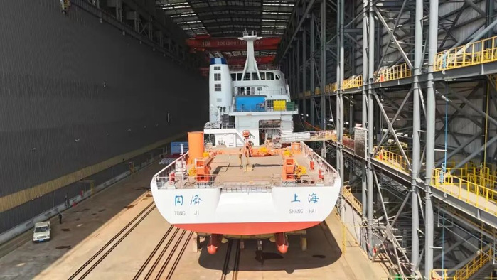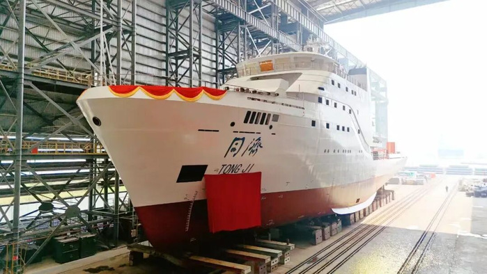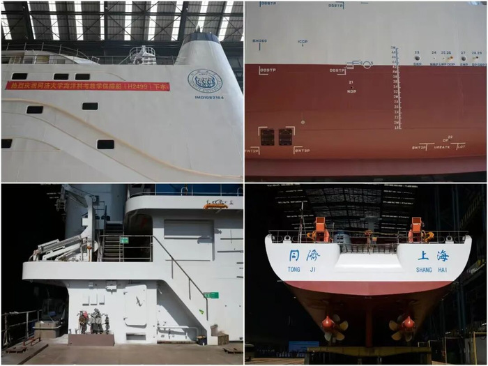 “同济”号自2024年4月在广州开工建造以来,前期已完成船台阶段建造工作,下水后将转入舾装和试航阶段,计划于今年5月交付。建成后将用于同济大学海洋学科和其他单位的科学考察航次、海上工程施工任务以及学生海上实习等需求,为海洋科学研究和涉海专业人才培养提供装备保障。