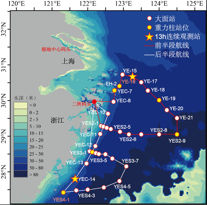 海洋科学专业实习包括大面站和连续站海洋调查相结合,根据东海陆架水团相互作用及其影响下的生态环境和沉积地质特征等,共布设了5条关键调查断面,分别是YE(Yangtze Estuary-East China Sea)主断面(也是东海海底科学观测网三个观测主节点所在断面),南侧YES2-4断面,以及YEC (Yangtze Estuary/Yellow Sea-East China Sea Continuum)断面。第一航段开展YES2、YE断面所有站位和YEC-7/8站位调查,第二航段开展YEC-10以南站位及YES3、YES4断面所有站位的调查。航次调查过程中全程开启浅地层剖面仪,进行海洋地球物理的探测;除了连续站外,各站位都进行生物拖网采取浮游生物样本,布放CTD取水器进行全水深海洋多参数观测与采取3-5个层位的水样,通过箱式采泥器采集浅表层沉积物等;并在一些关键站位采集重力柱状沉积物样。