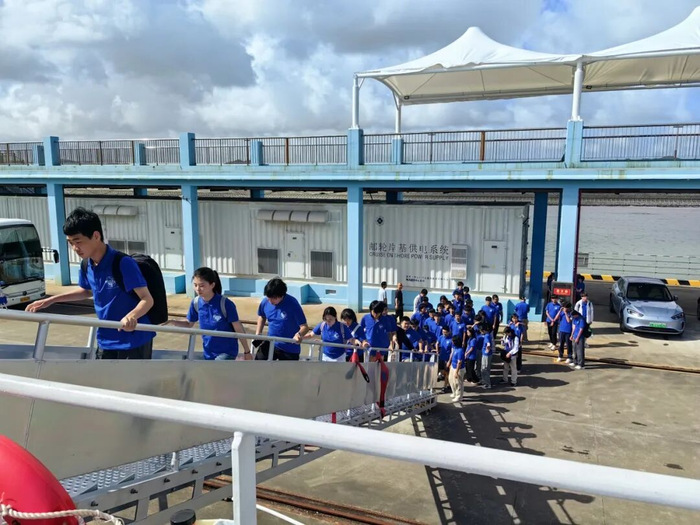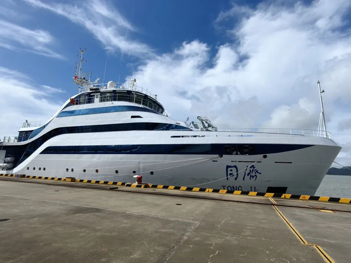 7月22日下午,“同济”号科考船入列后迎来了首批科考队员——参加同济大学2025年东海实习航次的老师和同学们。师生们首先被停泊在舟山国际邮轮码头的科考船惊艳外形所吸引,驻留片刻后,他们迈着矫健的步伐走上舷梯,进入船舱注册报到后成为入住“海上大学”的首批师生。