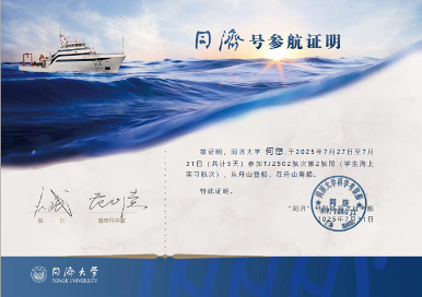 从实验室到深海,从课堂理论到国家海底观测网建设实践,“同济”号的首航之旅,既是一次海洋科学的探索之行,更是一堂生动的 “海洋强国课”。当年轻学子在甲板上接过参航证书时,接过的不仅是实践成果,更是 “经略海洋” 的时代接力棒。这艘智慧之舟正以 “同舟共济、钩深致远”的海洋精神为指导,为培养引领未来海洋科技的领军人才,书写着新时代的 “同济答卷”。