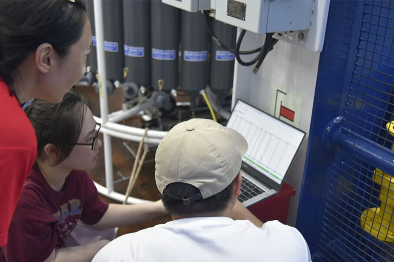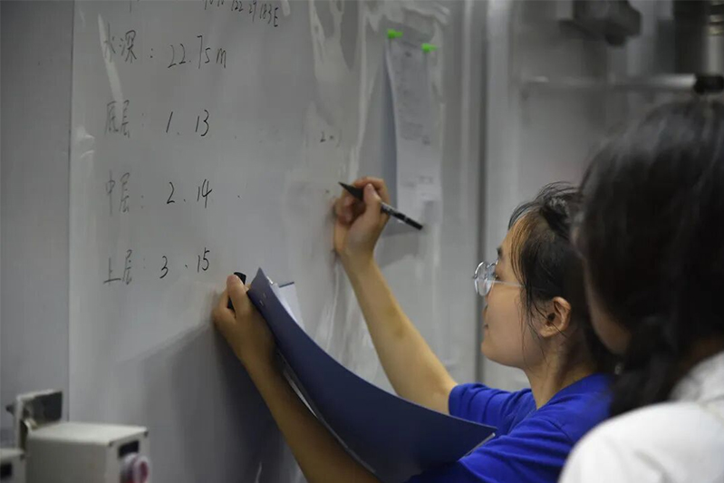 博士生陈俊源连续值班指导物理海洋方向的同学进行CTD仪器操作采样和数据解读;研究生刘沛瑜回忆本科时登上实习船首次开启海洋探索实践,到三年后以研究生助教身份登上“同济”号,身份的转变让其更深刻地理解了此次海上实习的意义。通过交流,已经看到青年学子在风浪考验中的快速成长,以热爱赴山海,更看到了同舟共济精神和海洋科考热忱的代际传递,期待新一代的同济海洋人借“同济”号之力,向着深蓝梦想加速前进,为国家海洋强国战略书写更加壮丽的新篇章。