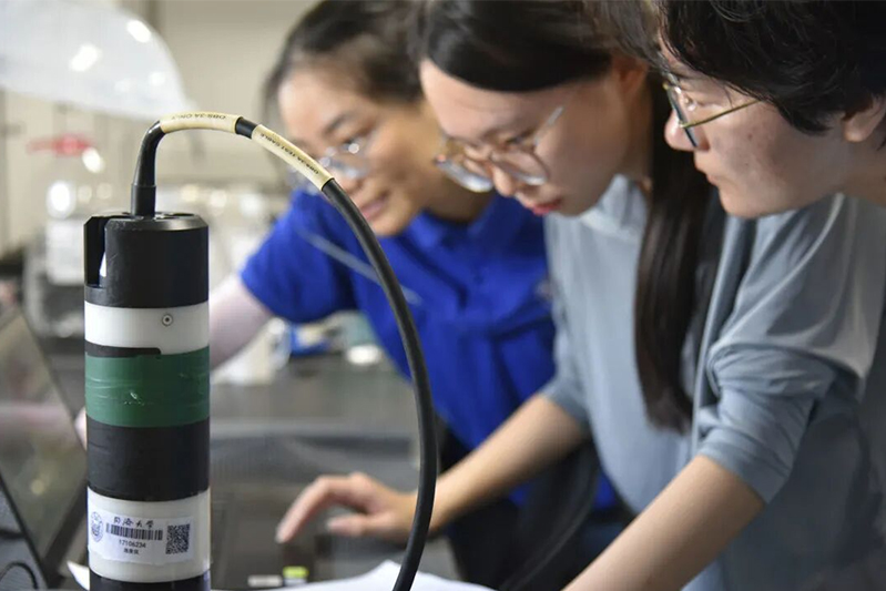 海洋地质采样技术组负责多管的安装、布放与采样;物理海洋观测组负责CTD的挂瓶、布放前检查、布放和回收采水与螺旋桨的布放;海洋化学观测组负责硝酸盐传感器的检查设置、布放回收与采集水样开展溶解氧和pH的室内测定工作;海洋生物光学观测组负责光合辐射剖面仪的准备、布放与回收工作,EXO2、野外藻类分析仪的设置、布放回收工作与水样采集开展叶绿素、悬浮颗粒物和水体浮游生物的实验室内样品采集测定工作。海上通讯技术组负责水声通讯、北斗卫星通讯等设备的安装、布放测试等工作。各组工作如何有序开展,考验着大家的组织协调能力、动手实践能力和对仪器设备的熟悉程度,时间紧任务重,大家经过在第一个站点实战操作的磨合,很快不仅可以独立工作,而且还会有序地将任务交接给下一个马上接替轮转任务的小组,尽心尽力地叮嘱注意事项和细节。在航行途中,远远望到“同济·海一号”东海多圈层观测塔矗立在茫茫大海之上,这种和我们遥相呼应的感觉,熟悉亲切又令人自豪,而同学们在船上工作时的这种相互信赖、互帮互助的团体精神也将“同济”二字体现的淋漓尽致。