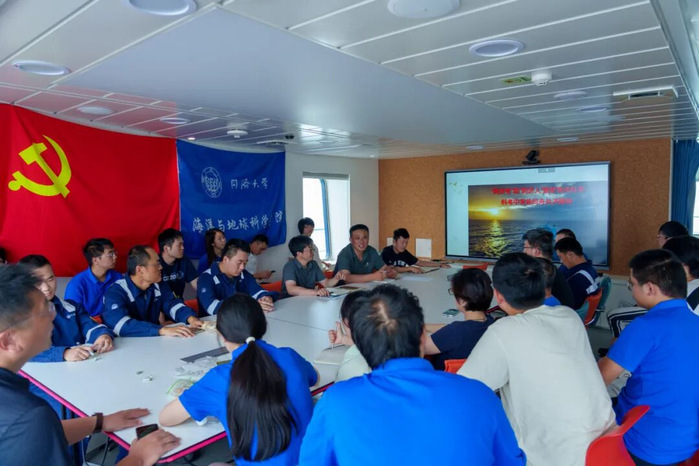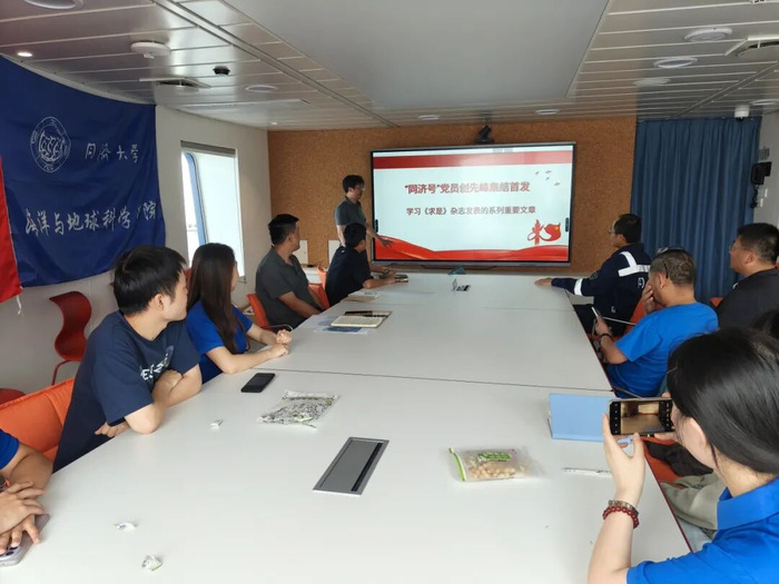 在全体科考人员与船员座谈之后,共产党员和入党积极分子留下来继续交流,经学院党委同意后成立了TJ2502航次临时党支部,“同济”号党员创先锋集结首发,一起学习了《求是》杂志发表的系列重要文章,并围绕海洋科考中的挑战与成长、团结与奋斗展开深入交流,在风浪中凝聚起奋进的力量。