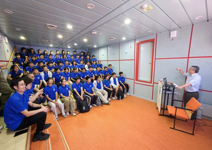 登船师生们按顺序参观了智能驾驶平台、舒适的生活休闲区、高性能实验室和多功能甲板作业区等,随后齐聚在阶梯教室,聆听学院院长、翦知湣院士主讲的“海上大学”开班第一课。翦老师回忆了多次参加国内外科考航次的经历,尽管收获颇多,但也有些许遗憾,希望能乘坐同济人建造的科考船探索深海大洋。在建院五十周年之际,这个梦想终于变成了现实,“同济”号正式交付使用,第一个任务就是承担本科生的海上实习航次,充分体现了学校对人才培养的高度重视。