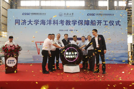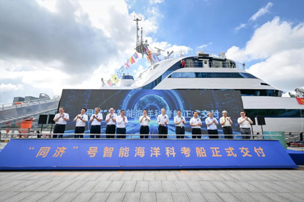 “5、4、3、2、1,启动!”今天(7月13日),上海北外滩国际客运中心码头,随着推杆落下,我国自主设计、建造的同济大学2000吨级智能海洋科考船“同济”号交付,这也是我国首艘海洋级智能综合科考船。交付后,“同济”号即将扬帆启航,在东海和南海辽阔海域开展多学科综合科考,承担“国家海底科学观测网”大科学工程运行维护等重要任务,同时成为学生海上实习的移动课堂。上海市发展改革委副主任裘文进,上海市教委副主任赵震,上海市科委副主任屈炜,上海市海洋局副局长金宏松,中国船舶集团黄埔文冲船舶有限公司董事长罗兵,同济大学党委书记、中国工程院院士郑庆华出席“同济”号交船仪式并分别致辞。同济大学原党委书记方守恩、陈大可院士、宋君强院士、王军成院士、翦知湣院士、中国舰船研究设计中心副所长李维林、中国船级社副总裁张庆文、中船704研究所所长助理陈次祥、天海融合防务装备技术股份有限公司总工程师寻正来、南方海洋科学与工程广东省实验室(珠海)首席工程师周宁、中国科学院海洋研究所所长王凡、自然资源部第二海洋研究所所长方银霞、上海工程技术大学校长娄永琪、崂山实验室副主任吴能友、中国极地研究中心副主任魏福海、中国科学院深