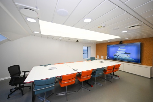 会议室位于驾驶甲板(5层)。整个驾驶甲板后部区域都安装了落地玻璃观景窗,可一览后甲板科考作业情况。