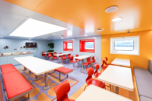 船上餐厅按远洋船舶规范划分为公共用餐区与高级船员餐厅,可满足日常用餐与活动聚餐等不同需求。室内设计通过大胆的撞色墙面进行功能分区,结合主照明软膜灯与局部点缀的射灯,营造出明亮而富有活力的用餐氛围。