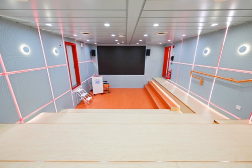 阶梯教室(报告厅)位于主甲板(1层),配备135寸高清液晶屏幕与专业音响系统,可容纳45人进行航次前的任务宣贯布置、安全培训以及航次中间的学术报告沙龙活动。