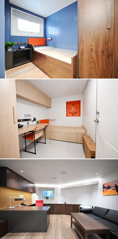 套间内还贴心配备了小型冰箱,也为胶囊咖啡机、茶具等预留了空间,可满足不同的生活习惯。住舱内部,色彩和灯光都由专业设计师精心布局,为需要长期在海上生活工作的科考人员营造温馨舒适的居住空间。